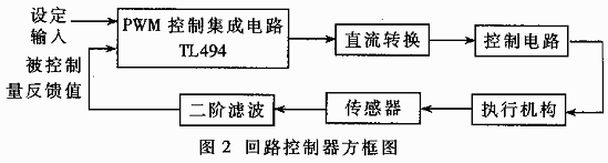 回路控制器的方框图如图2所示。被控制量(如压力、流量、温度等)通过传感器交换为0~5V的电信号,作为闭环回路的反馈信号,通过有源简单二阶低通滤波电路进行平滑、去除杂波干扰后送给TL494的误差放大器I的IN+同相输入端。设定输入信号是由TL494的5V基准电压源经一精密多圈电位器分压,由电位器动端通过有源简单二阶低通滤波电路接入TL494的误差放大器I的IN-反相输入端。反馈信号和设定信号通过TL494的误差放大器I进行比较放大,进而控制脉冲宽度,这个脉冲空度变化的输出又经过整流滤波电路及由集成运算放大器构成的隔离放大电路进行平滑和放大处理,输出一个与脉冲宽度成正比的、变化范围为0~10V的直流电压。这个电压就是所需要的输出控制电压,用它去控制执行电路,及时调整被控制量,使被控制量始终与设定值保持一致,形成闭环单回路控制。